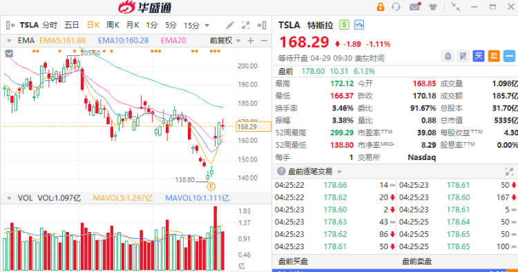 特斯拉盘前涨超6%,百度涨近5%,据悉其将在中国与百度就地图和导航功能展开合作。