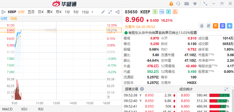 4月30日,Keep(03650)早盘再涨超9%,本月股价实现翻倍。截至发稿,涨10.21%,报8.96港元,成交额8853万港元。