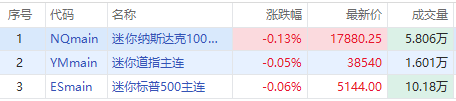 周二美股盘前,三大股指期货小幅走弱,截至发稿,纳指期货 $NQmain 跌0.13%,标普500指数期货 $ESmain 跌0.06%,道指期货 $YMmain 跌0.05%