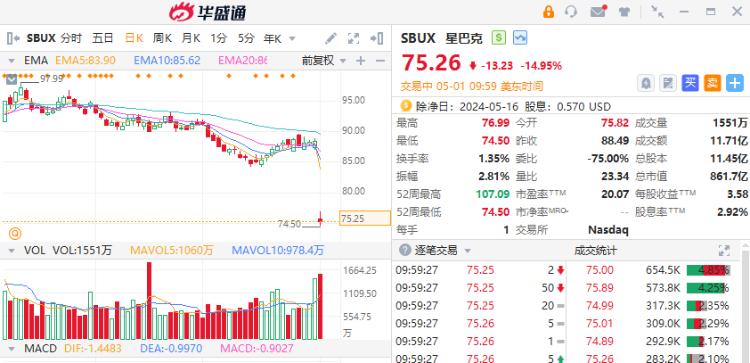据星巴克财报显示,该公司销售额自2020年以来首次出现季度下滑,第一季度(第二财季)销售额同比下降4%,而分析师预计将增长1.46%。其在中美两国的销售都表现不佳,美国同店销售下降3%,中国则下降11%。