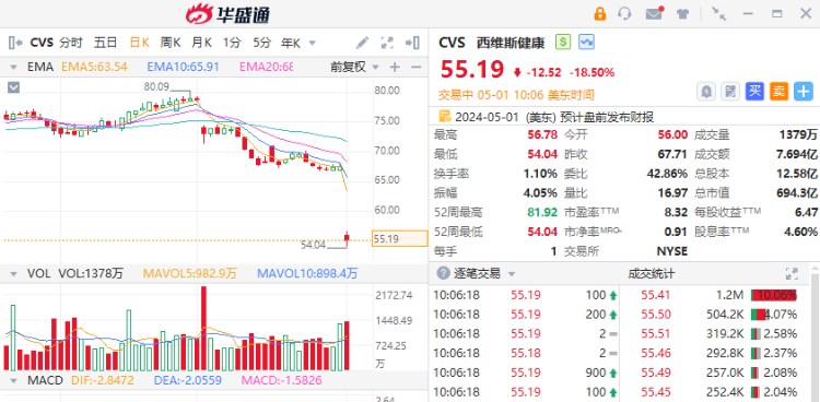 西维斯健康跌18.55%,报55.15美元。CVS健康第一季度销售额为884亿美元,同比增长3.7%,未达到市场预期的892.1亿美元;调整后每股收益为1.31美元,较去年同期的2.20美元有所下降,未达到市场预期的1.69美元,这主要是由于医疗保健福利板块的经营业绩下降。CVS健康将2024年调整后的每股收益预期从至少8.30美元下调至至少7.00美元,而市场普遍预期为8.27美元。