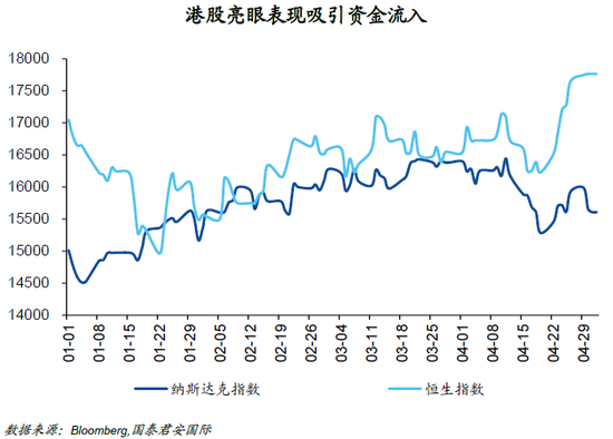 从这个角度而言,市场仍然会把关注的焦点放在港股上。4月以来,恒生指数的表现亮眼,远超美股。这在很大程度上表明市场在重新定价美国货币政策的同时,也开始在重新定价中国经济的表现。