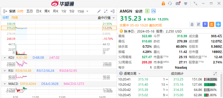 成分股安进 $AMGN 维持13%的涨幅,减肥新药中期试验获积极数据;拉美电商巨头Mercadolibre $MELI 涨超10%,第一季度财务业绩好于预期;苹果 $AAPL 维持6.8%的涨幅,Q2业绩好于预期并宣布破纪录1100亿美元回购。