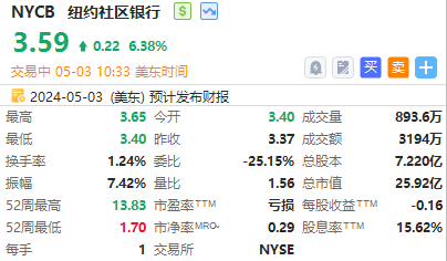 周五,纽约社区银行(NYCB.US)股价走高,截至发稿,该股涨超6%,报3.59美元,成交量超3194万。Wedbush将该股评级上调至“中性”。