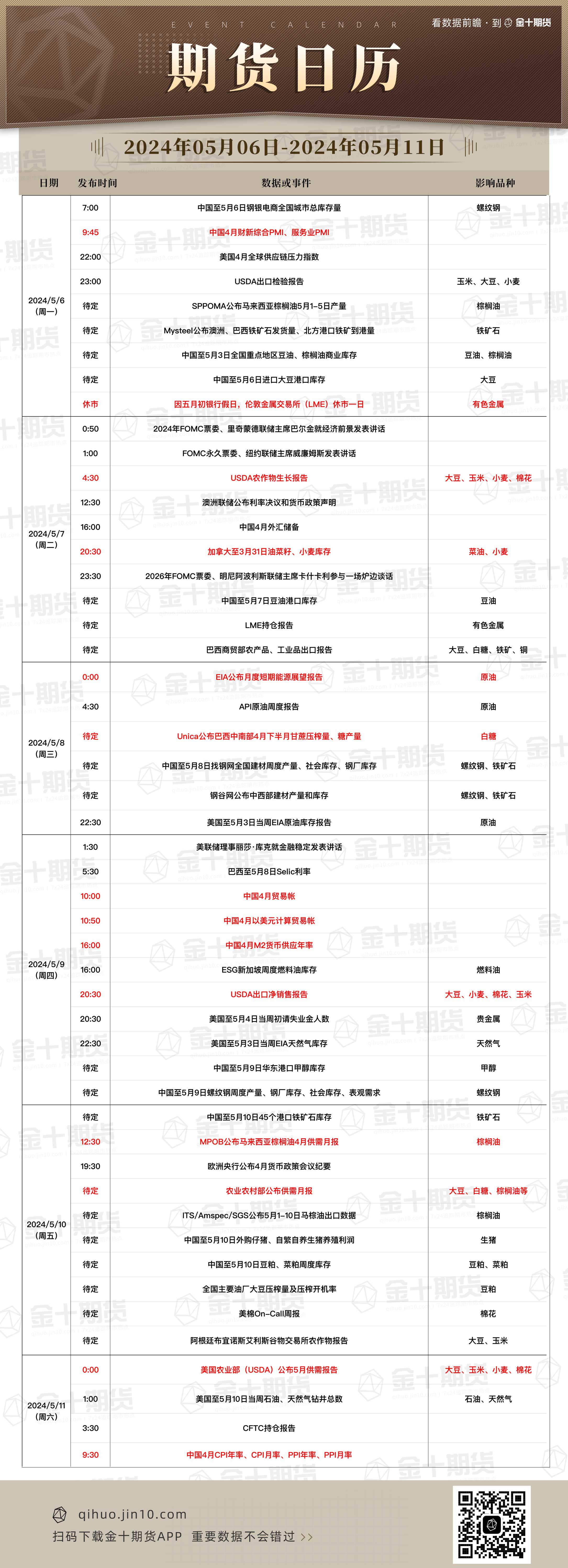 10. 5月11日0:00,美国农业部(USDA)公布5月供需报告。USDA 5月供需月报将提供对新作物需求和单产潜力的首次预估,这为市场全年的工作提供了一条基准线,关注对美国2024/25年度大豆单产、产量的预测。