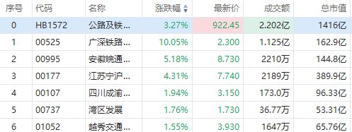 5月6日讯,港股公路铁路概念走强,截至发稿,广深铁路股份早盘高开高走,现涨10.05%创近一年新高,安徽皖通高速公路(00995)涨逾5%,江苏宁沪高速公路(00177)涨逾4%。