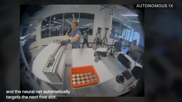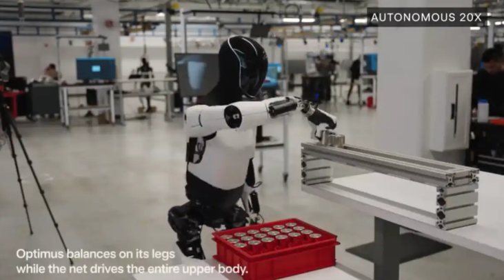 在分拣电芯时,Optimus用腿保持平衡,并用神经网络驱动整个上半身。这一任务对动作精确度要求高,供电芯插入的空间余量很小,而神经网络也会自动瞄准下一个空闲插槽。
