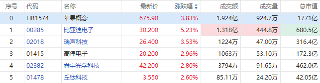华盛资讯5月7日消息,港股早盘,苹果概念股领涨大市,截至发稿,比亚迪电子涨超5%,瑞声科技涨超3%,高伟电子、舜宇光学科技、丘钛科技涨近3%。