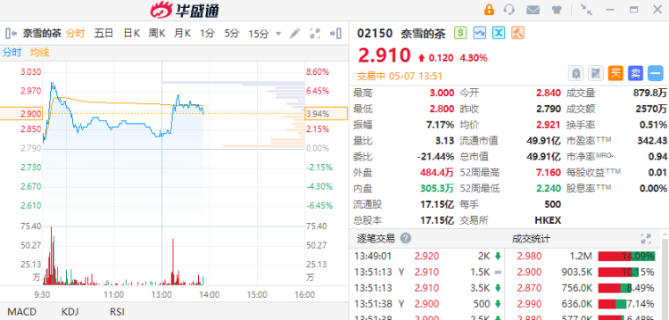 5月7日,奈雪的茶(02150)午后走强,截至发稿,涨4.3%,报2.91港元,成交额2570万港元。
