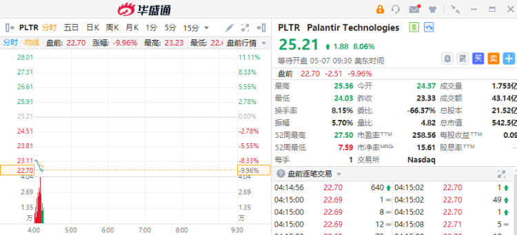 Palantir盘前跌超9%,Q1营收高于预期,但业绩指引略逊于预期。