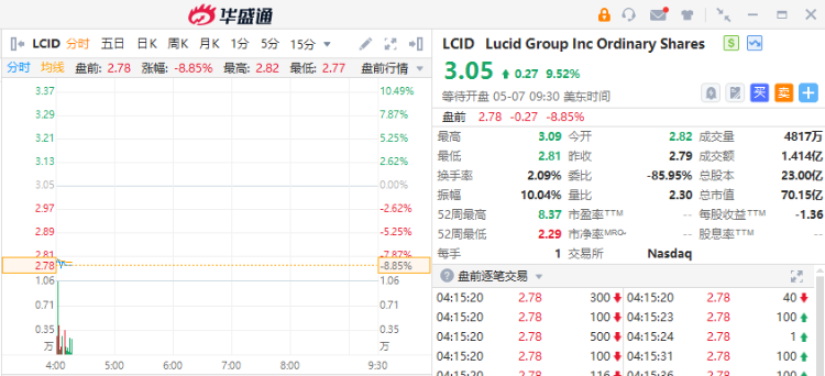 Lucid盘前跌超8%,第一季度亏损超预期。