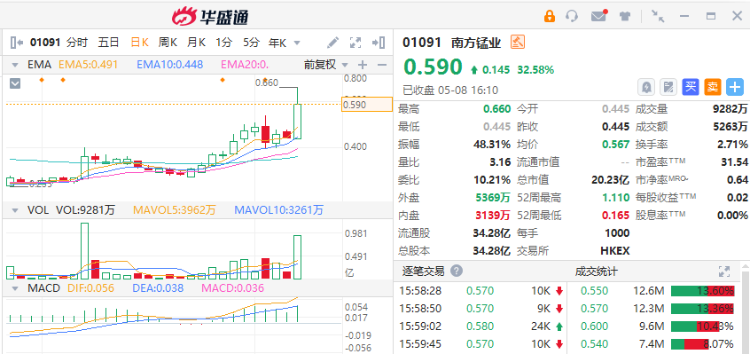 南方锰业大涨超32%,近一月股价已飙升超1月。消息面上,澳大利亚South32公司在最新发布的一季度报告中透露,由于基础设施损毁,预计其码头运营和出口销售将暂停至2025年一季度。这一事件预计将对全球锰矿供应造成重大影响,预计减少供应量约241.5万吨,占全球锰矿产量的11.3%。此消息导致国内锰硅期货大幅走高,锰硅主力合约创2022年6月20日以来新高。