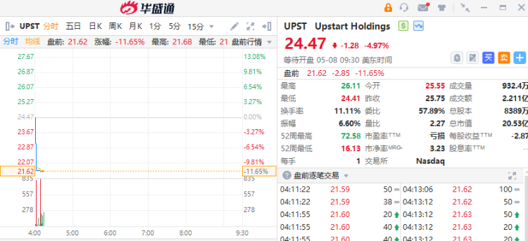 Upstart盘前跌超11%,第二季度业绩指引不及预期。