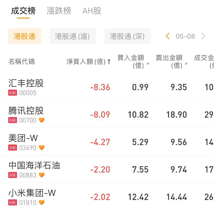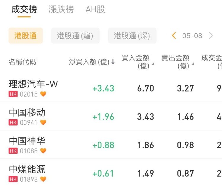 其中,南向资金净买入理想汽车-W3.43亿港元,加仓中国移动、中国神华,金额分别为1.96亿港元、0.88亿港元;净卖出汇丰控股、腾讯控股分别为8.36亿港元、8.09亿港元。