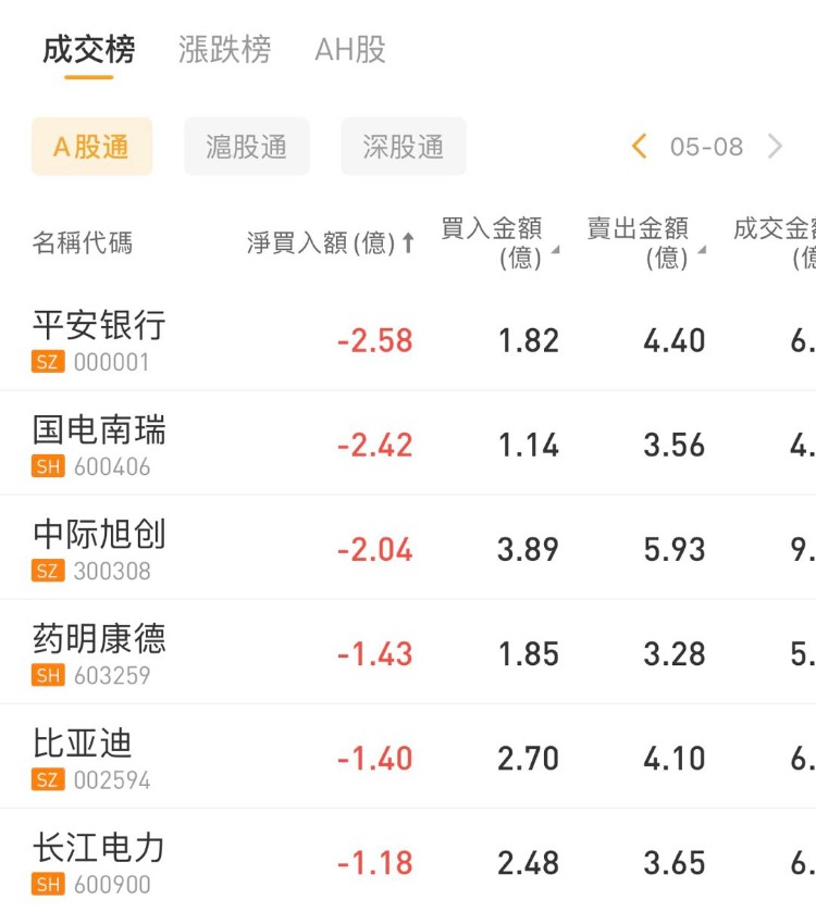 北向资金今日净卖出40.44亿元。平安银行、国电南瑞、中际旭创分别遭净卖出2.58亿元、2.42亿元、2.04亿元;汇川技术逆势获净买入3.95亿元。