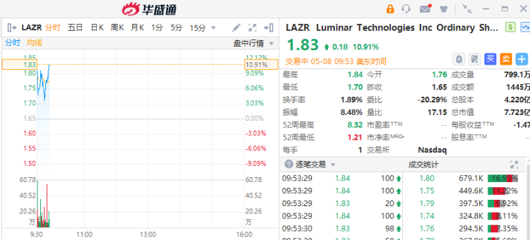 Luminar涨超10%,Q1销售额同比增长超44%,特斯拉为最大客户。