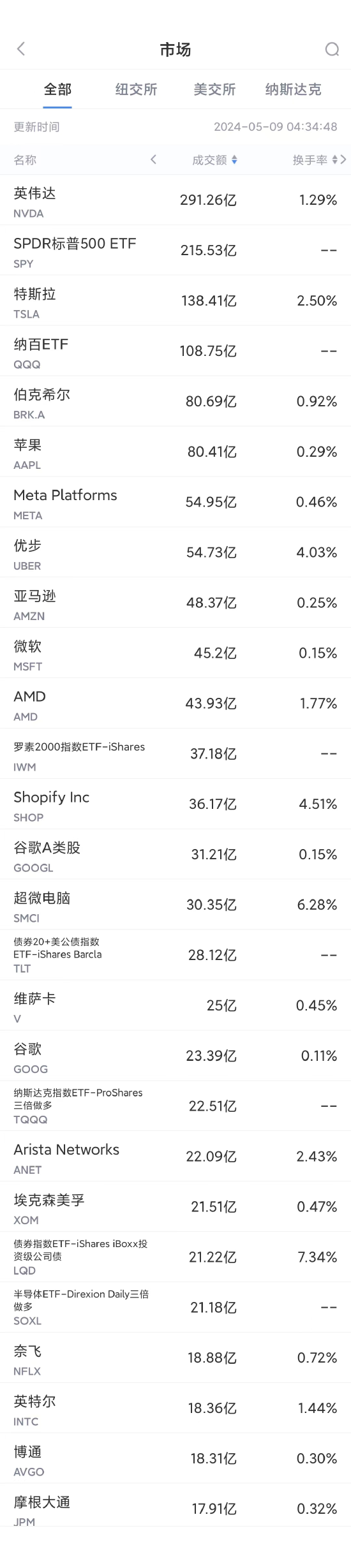 第4名苹果收高0.19%,成交80.41亿美元。周二,苹果公司发布了配备全新M4处理器的最新款iPad pro。该芯片为iPad Pro提供了许多改进,包括更快的CPU和更新的图形处理单元。