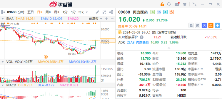 5月9日讯,港股再鼎医药(9688.HK)大幅上涨超21%,现报16.02港元,成交额放大至2.17亿港元,总市值158亿港元。