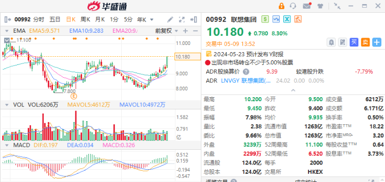 5月9日讯,港股联想集团午后持续走高,上涨8.30%,现报10.18港元,成交额5.95亿港元。