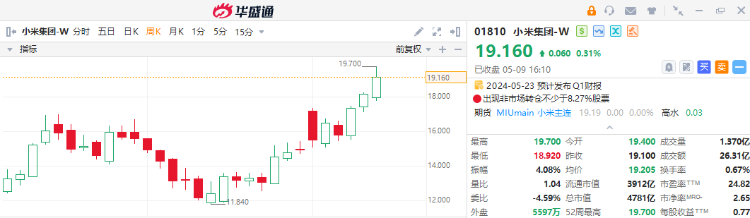 4、小米集团周涨超5%,第三方数据显示小米Q1手机出货量同比增长34%;中金看好Q1业绩,上调目标价至23港元