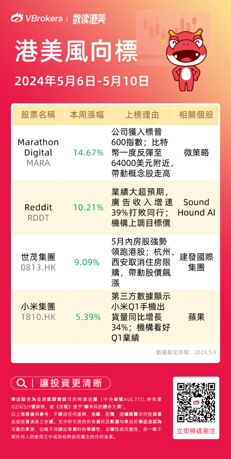 1、Marathon Digital周涨近15%,公司获纳入标普600指数;消息面上,比特币一度反弹至64000美元附近,带动概念股走高