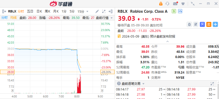 Roblox盘前重挫逾28%!预计第二季度预订量不及预期