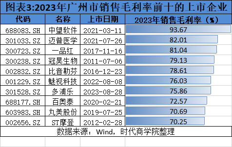从销售毛利率上看,有41家企业的销售毛利率高于40%,占比达26.11%。其中,中望软件(688083.SH)、迈普医学(301033.SZ)、一品红(300723.SZ)分列前三,销售毛利率分别高达93.67%、82.01%、81.04%。另外,冠昊生物(300238.SZ)、比音勒芬(002832.SZ)、魅视科技(001229.SZ)、多浦乐(301528.SZ)、百奥泰(688177.SH)、丸美股份(603983.SH)等多家企业的销售毛利率也均超过70%。