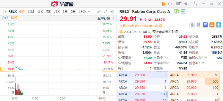 Roblox重挫超23%,Q2业绩指引逊预期,下调全年预订量指引。
