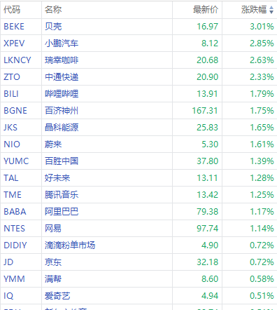 其中,贝壳涨超3%,小鹏汽车涨超2%,哔哩哔哩、百济神州、晶科能源、蔚来、阿里巴巴涨超1%。