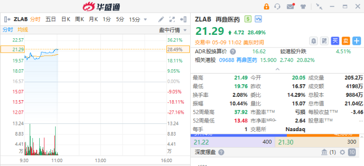 再鼎医药 $ZLAB 大涨超28%,报21.29美元。