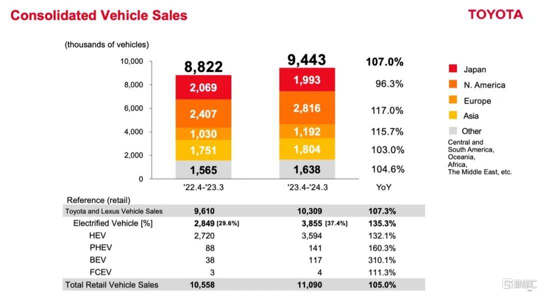 海外市场的销售表现也是一大亮点。北美作为丰田最大的市场,在过去一年贡献超280万辆的新车销量,也高于2022财年的240万辆。