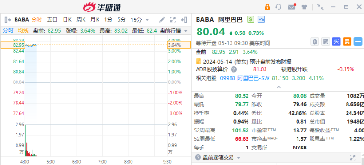 阿里巴巴盘前涨超3%。今日阿里巴巴港股盘中创2023年11月16日以来新高。阿里巴巴将于明日盘后公布2024财年第四财季及全年业绩。