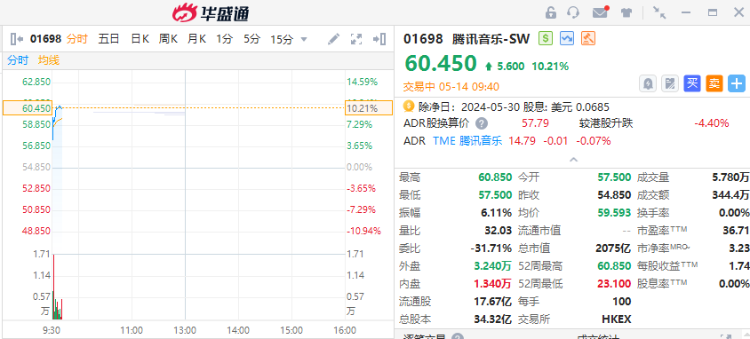 腾讯音乐-SW $01698.HK 绩后涨超10%,截至发稿,涨10.21%,报60.45港元,成交额344.4万港元。