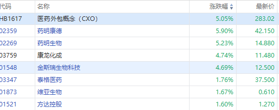 港股CXO概念盘初冲高,药明康德、药明生物涨超5%,康龙化成、金斯瑞生物科技涨超4%,泰格医药、维亚生物等跟涨。
