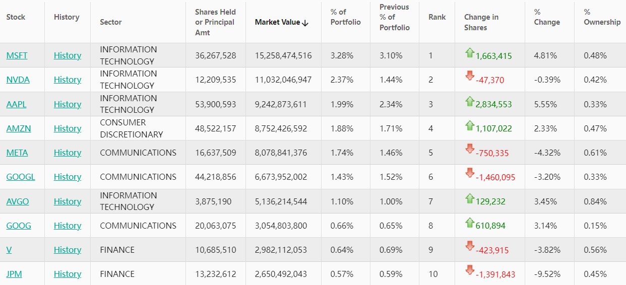 Meta(META.US)位列第五,持仓约1664万股,持仓市值约为81亿美元,占投资组合比例为1.48%,持仓数量较上季度减少4.32%。