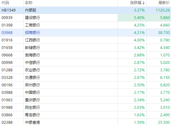 内银股早盘全线走高,截至发稿,建设银行涨超5%,招商银行、工商银行涨超4%,邮储银行涨超3%,中信银行涨超2%。