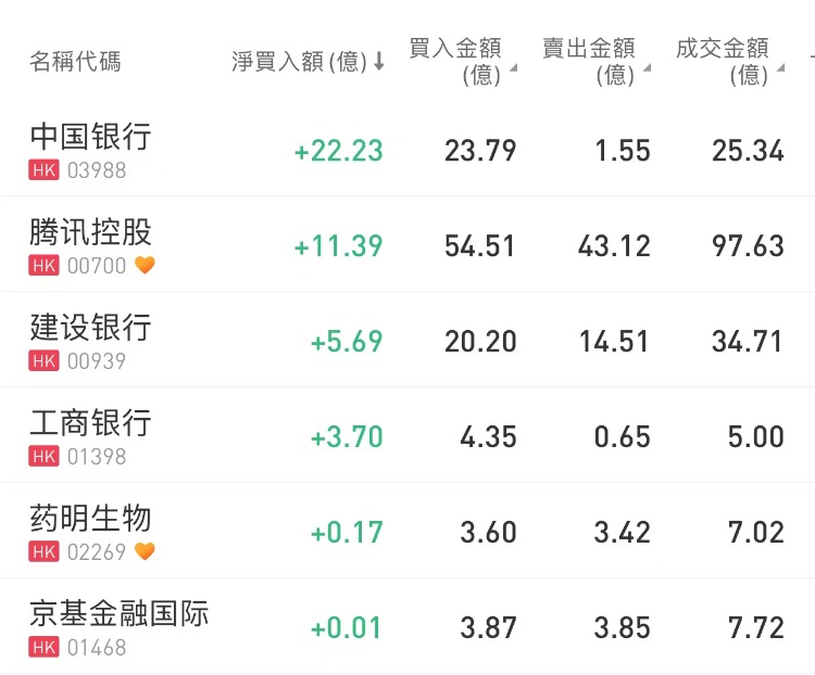 其中,南向资金净买入中国银行22.23亿港元、腾讯控股11.39亿港元、建设银行5.69亿港元;净卖出盈富基金17.74亿港元、恒生中国企业5.33亿港元、美团-W5.19亿港元。
