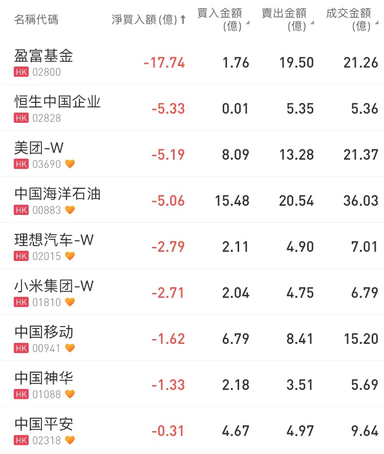 南向资金净买入中国银行,净卖出盈富基金