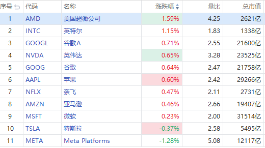 美股科技股多数上扬,截至发稿,美国超微公司、英特尔涨超1%,谷歌、英伟达、苹果涨近1%;Meta $META 跌超1%。
