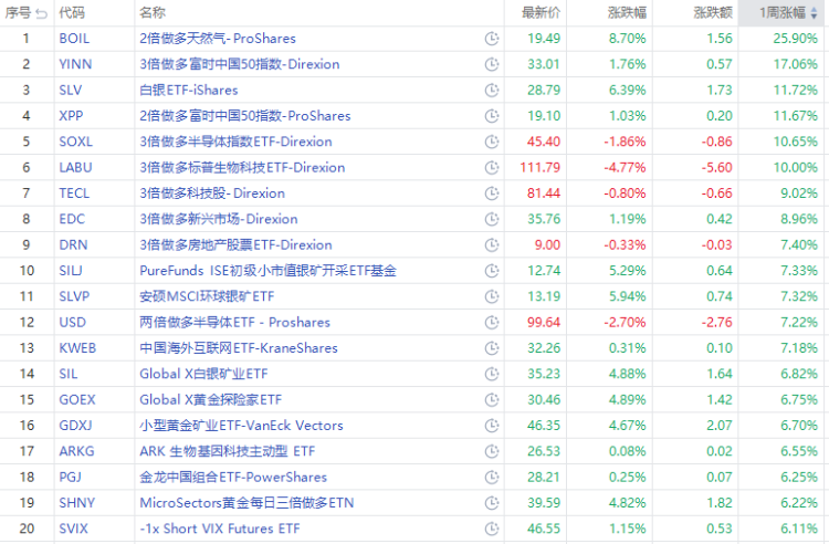 本周美股ETF涨幅榜,2倍做多天然气涨 $BOIL 25.9%,3倍做多富时中国50指数 $YINN 大涨17%,2倍做多富时中国50指数 $XPP 涨11.67%;行业方面,3倍做多半导体指数 $SOXL 涨10.65%,3倍做多标普生物科技ETF $LABU 涨10%,3倍做多科技股 $TECL 涨超9%。