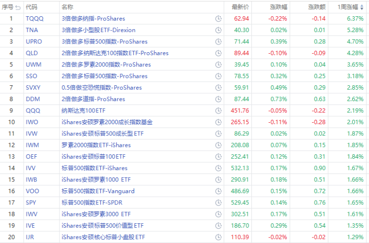指数ETF方面,3倍做多纳指 $TQQQ 涨6.37%、3倍做多小型股ETF $TNA 周涨超5.28%,3倍做多标普500指数 $UPRO 周涨4.7%,2倍做多罗素2000指数 $UWM 涨超3%。