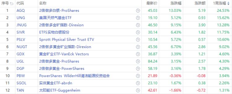 大宗商品ETF方面,2倍做多白银 $AGQ 涨超24.5%、ETFS实物白银股份涨近12%;美国天然气基金ETF周涨超15%,2倍做多金矿指数 $JNUG 周涨超13%。