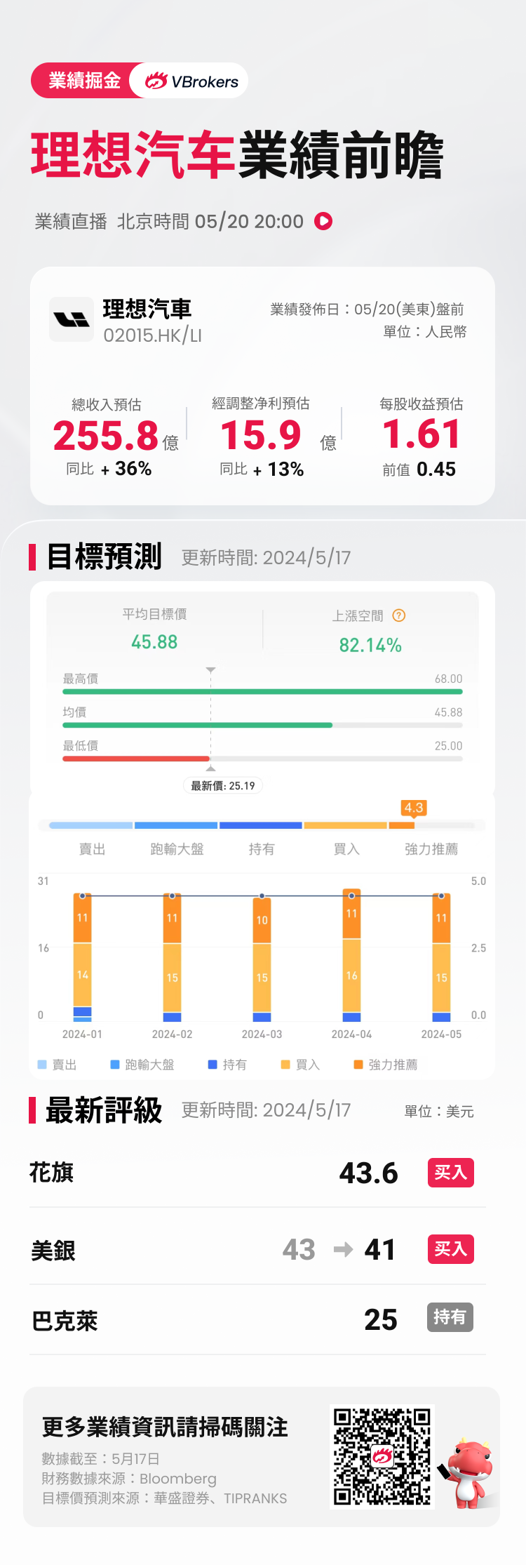 近期共有位26分析师给出理想汽车“买入”及以上评级,平均目标价格45.88美元。