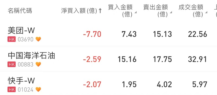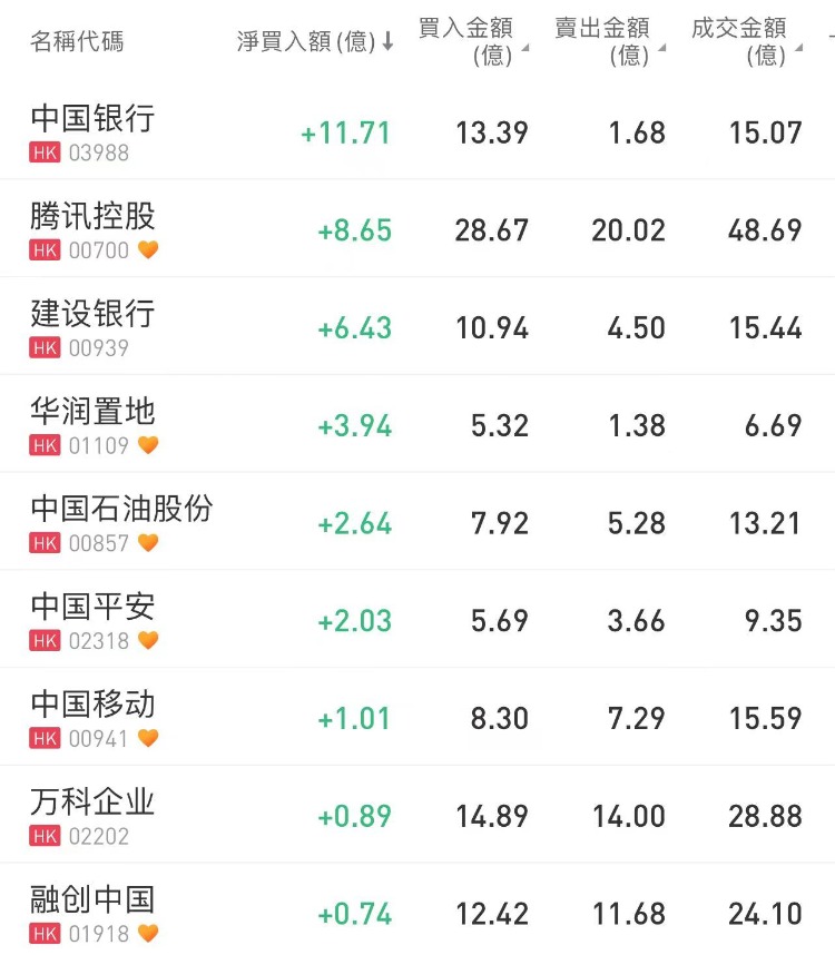 其中,南向资金净买入中国银行11.71亿港元、腾讯控股8.65亿港元、建设银行6.43亿港元;净卖出美团-W7.7亿港元、中国海洋石油2.59亿港元、快手-W2.07亿港元。