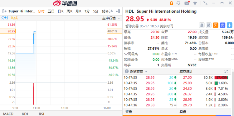 华盛资讯5月17日消息, 海底捞海外子公司特海国际美国IPO $HDL 首日开盘涨48%,最高报29.7美元,此前给出的IPO发行价为每份ADS 19.56美元。