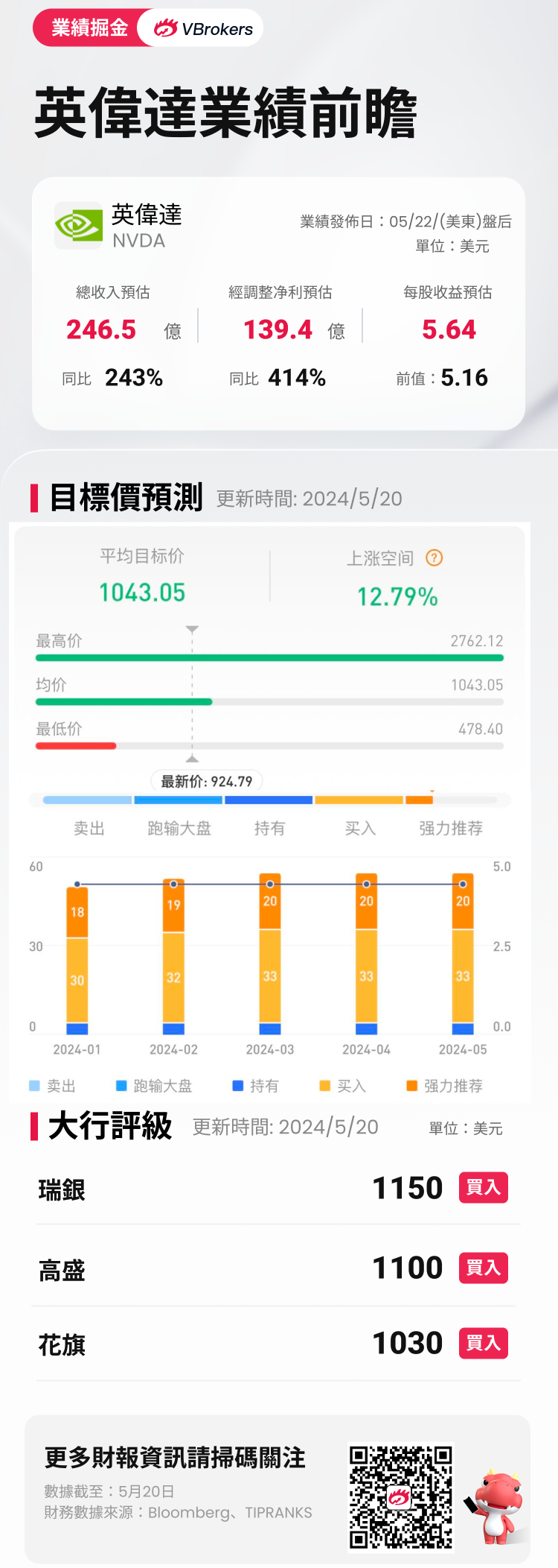 据彭博分析师预期,英伟达Q1营收为246.5亿美元,同比增长243%;调整后净利润139.4亿美元,同比上升414%;每股收益为4.64美元。近期共有33位分析师给出“买入”评级,平均目标价1043.05美元。