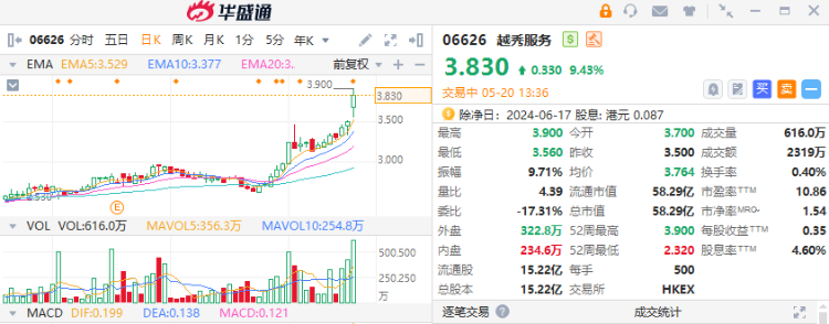 越秀服务(6626.HK)盘中拉升涨近10%至3.83港元,股价创2023年4月以来新高。消息面上,集团公布,拟于公开市场购回不多于约3044.06万股公司股份,占已发行股份总数的2%。