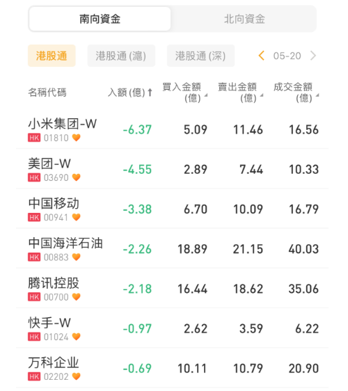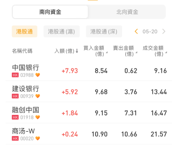 其中,南向资金净买入中国银行7.93亿港元、建设银行5.92亿港元、融创中国1.84亿港元;净卖出小米集团-W6.37亿港元。