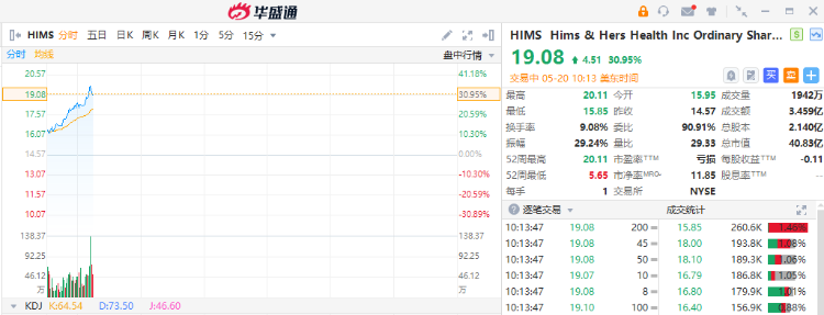 华盛资讯5月20日消息, 平价医疗保健公司Hims & Hers Health Inc. $HIMS 美股盘初涨幅扩大至30%,公司首发减肥药,每针较诺和诺德Wegovy低85%,较礼来制药也提供大约一五折。