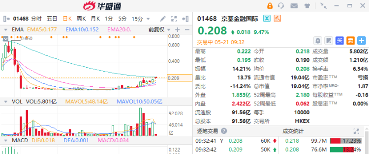 5月21日讯,港股京基金融国际(01468)大幅高开14.74%,截至发稿涨9.47%,报0.208港元,成交额1.21亿港元。